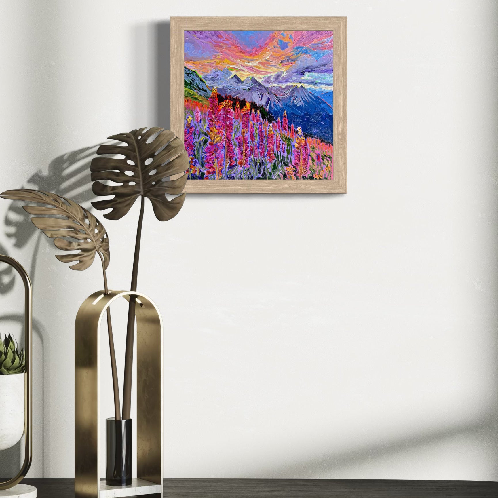I start every painting by laying down bold color swatches to test the relationships between hues. You can see that DNA here - the way the neon pinks of the flowers interact with the deep greens isn't accidental; it's calculated. The texture of the foreground pops against the smooth, atmospheric fade of the peaks.
